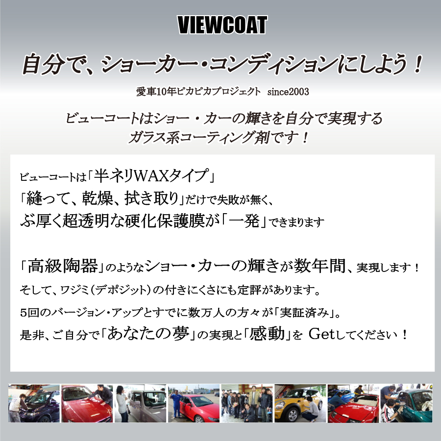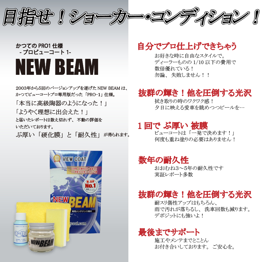 「ニュービーム40セット」 ガラス系コーティング剤 ビューコート (VC-NBS040) 定価(税込)¥4,400販売価格(税込)¥4,400在庫状態 : 在庫有り 発送方法 : 宅急便 商品コード(JANコード) : 4560391470012 コーティング剤定価bnr_info_01bnr_info_02 商品名 コーティング剤 ニュービーム 40gセット 商品内容 コーティング剤 ニュービーム 40g、 クロス1枚、塗り込みスポンジ1個、スプーン1個、メンテナンス剤エーナ50ml、施工説明書 ※「クロス」や「塗りこみスポンジ」は商品画像と色違いのものが入る場合がございます。予めご了承ください。 主成分 ケイ素、アルコール、シリコン類、火気厳禁 保管方法 使用後はキャップをしっかりしめて、車内放置を避け暗所にて保管してください。 使用期限 使用後は1年以内を目安に使い切ってください。 【参考 車種別 目安使用量】 ■軽自動車 N-BOX、スペーシア、タント クラス 【約20-22g】 ■日産 ノート、ホンダ フィット、トヨタ ヴィッツ クラス、マツダ デミオ クラス 【約20-22g】 ■トヨタ プリウス、タンク ルーミー、ホンダ フリード、スバル インプレッサ クラス 【約24-26g 】 ■トヨタ C-HR、ホンダ ヴェゼル クラス 【約26-28g 】 ■日産 セレナ、トヨタ ヴォクシー、ホンダ ステップワゴン クラス 【約30g】 数量個
