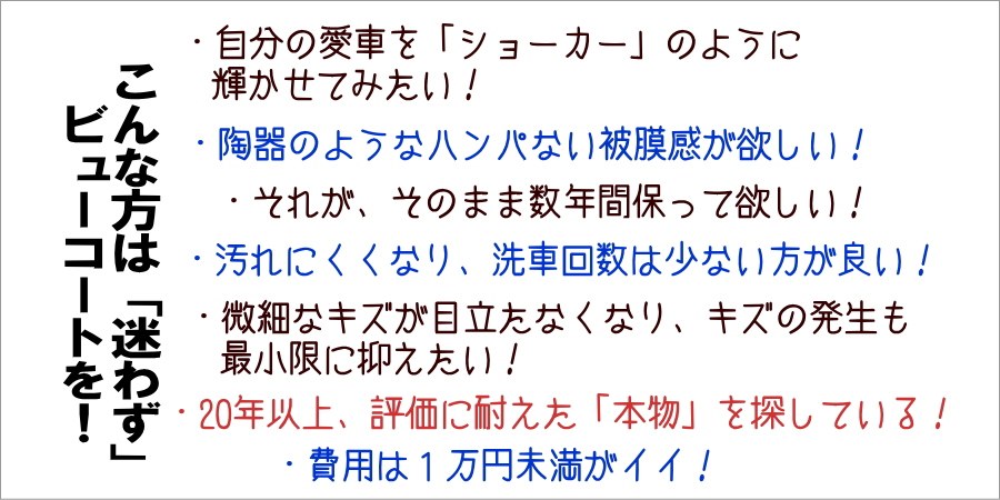ビューコートは、失敗が無いように設計され「ぶ厚い保護膜」を一発でキメ、素晴らしい耐久性を誇ります!!