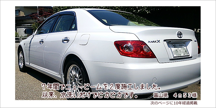 | ■5年前にPRO-3を新車へ施工してました。手入れは時々洗車する程度です。 しかし、水垢すら付いていません。洗車キズもありません。「テフロン仕様」は嘘ではありません。 今回、5年振りにPRO-3の再施工をしました。更にぶ厚い保護膜となり、これは5年以上大丈夫と確信しました。 |